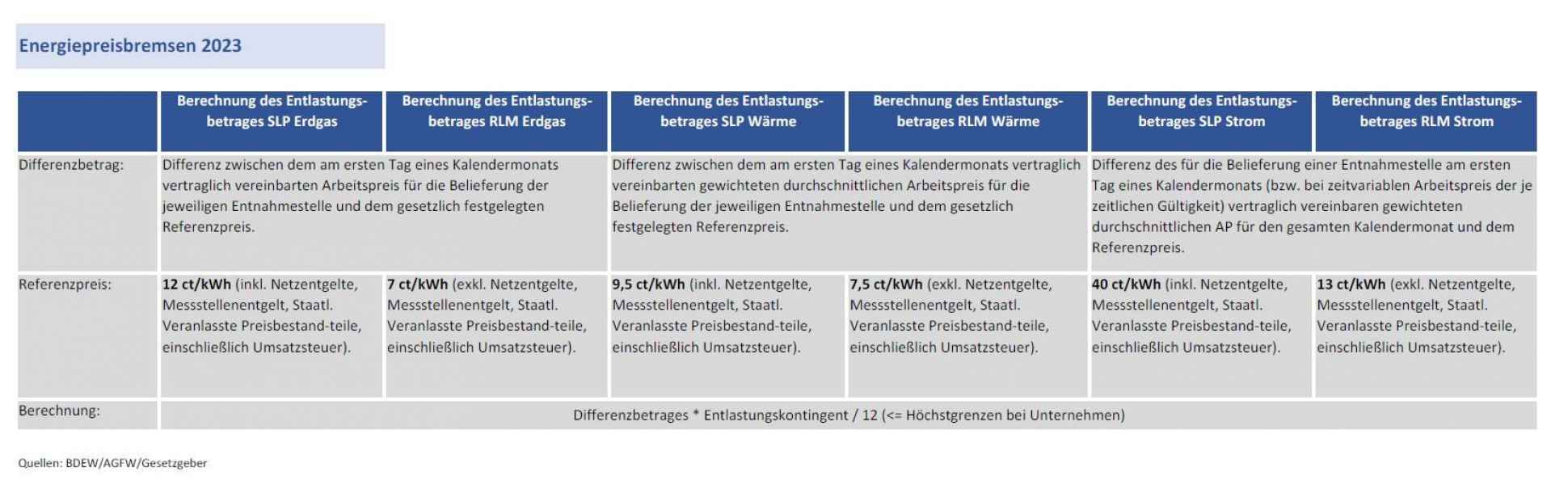 - Der Referenzpreis beträgt 12 Cent/kWh für Gas und 40 Cent/kWh für Strom und gilt nur für 80 % des Jahresverbrauchs, der in 2022 prognostiziert wurde.